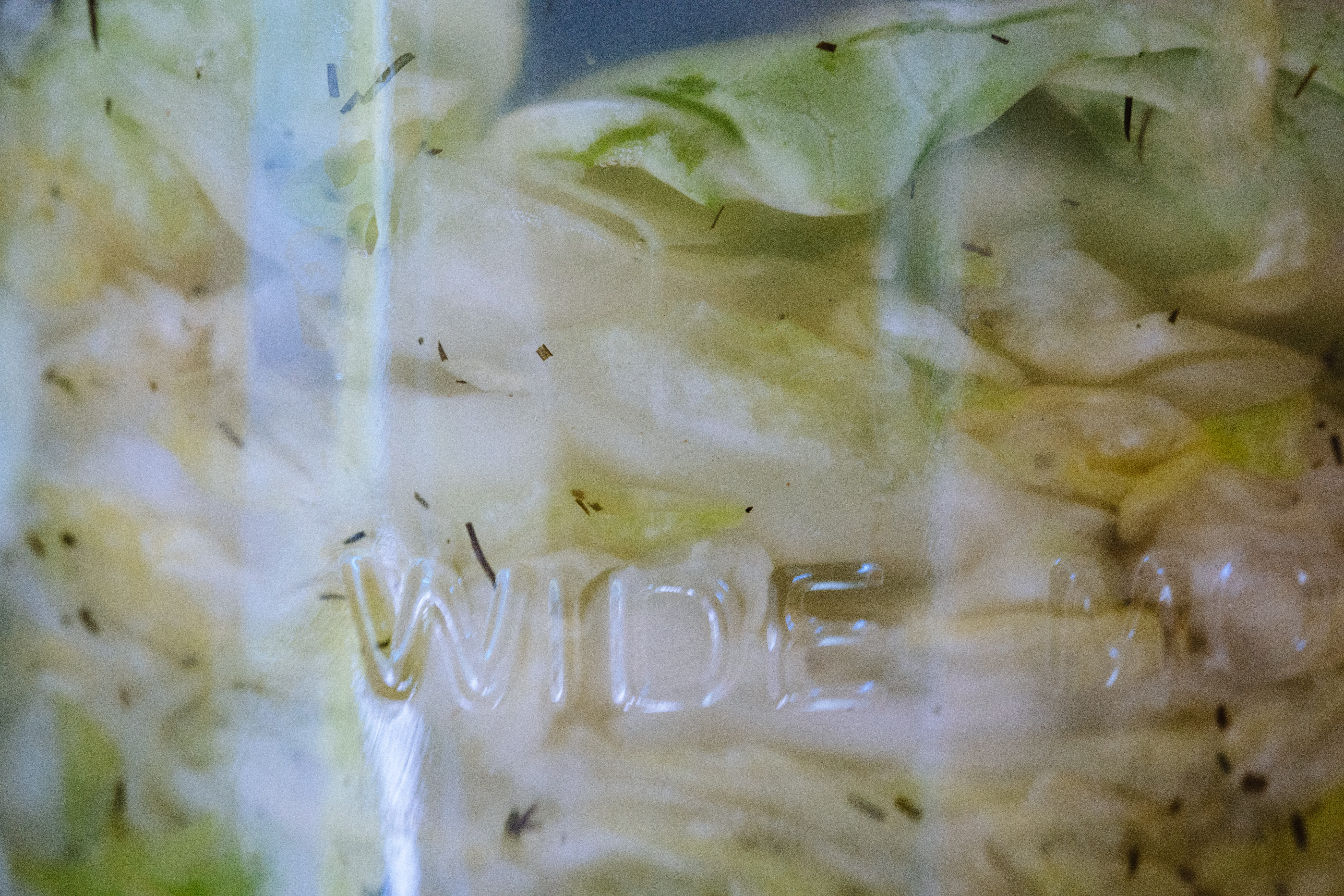 Make sure your cabbage stays submerged in brine at all times as this prevents mold. If it starts to float, press it back down.