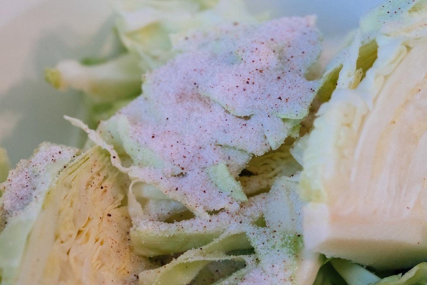 5. Salt the cabbage: Add the salt and massage it into the cabbage with clean hands for a few minutes.